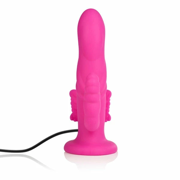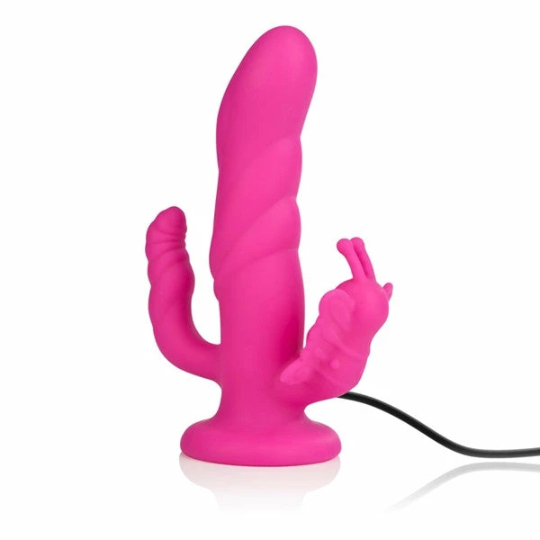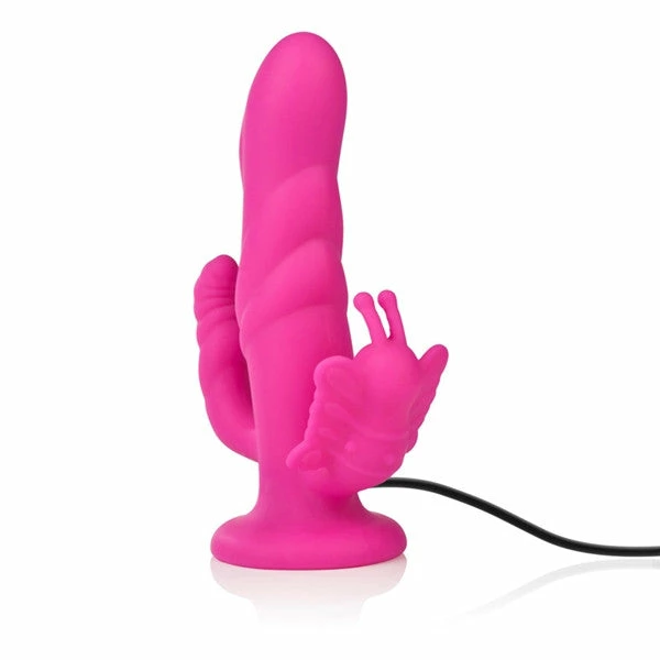 The 10-Function Silicone Love Rider® Butterfly Riders™ vibe by CalExotics is a premium, solid, sturdy silicone triple probe that can be used with or without a harness. This complete strap-on system accessory features a curved g-spot tip, a vibrating butterfly clitoral stimulator, a gently ribbed shaft that flexes and moves with you and a stimulating anal tail.