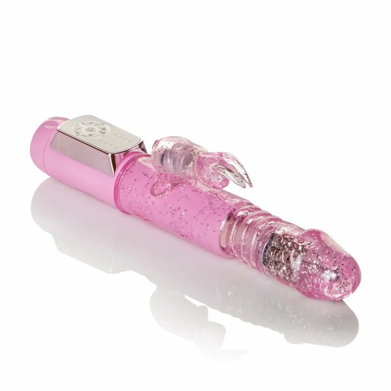 The glitter finish rabbit massager measures a compact 5″ x 1.25″/12.75cm x 3.25cm and is made from smooth and soft TPR, and has an easy push button ABS controller with auto off switch. The power-packed thrusting massager has a flexible shaft with pleasure ridges, a smooth rounded tip, and a curvy bunny teaser, with flickering ears. Use it to massage, arouse and stimulate sweet pleasure spots all over the body.Â