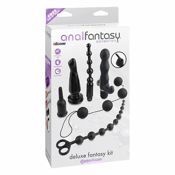 Like all Anal Fantasy Collection products, the Deluxe Fantasy Kit comes with a 5 piece prep kit including two finger sleeves and sample Anal Eaze Insertz™ Cream, Moist® Anal Lube, and Refresh® Toy Cleaner.